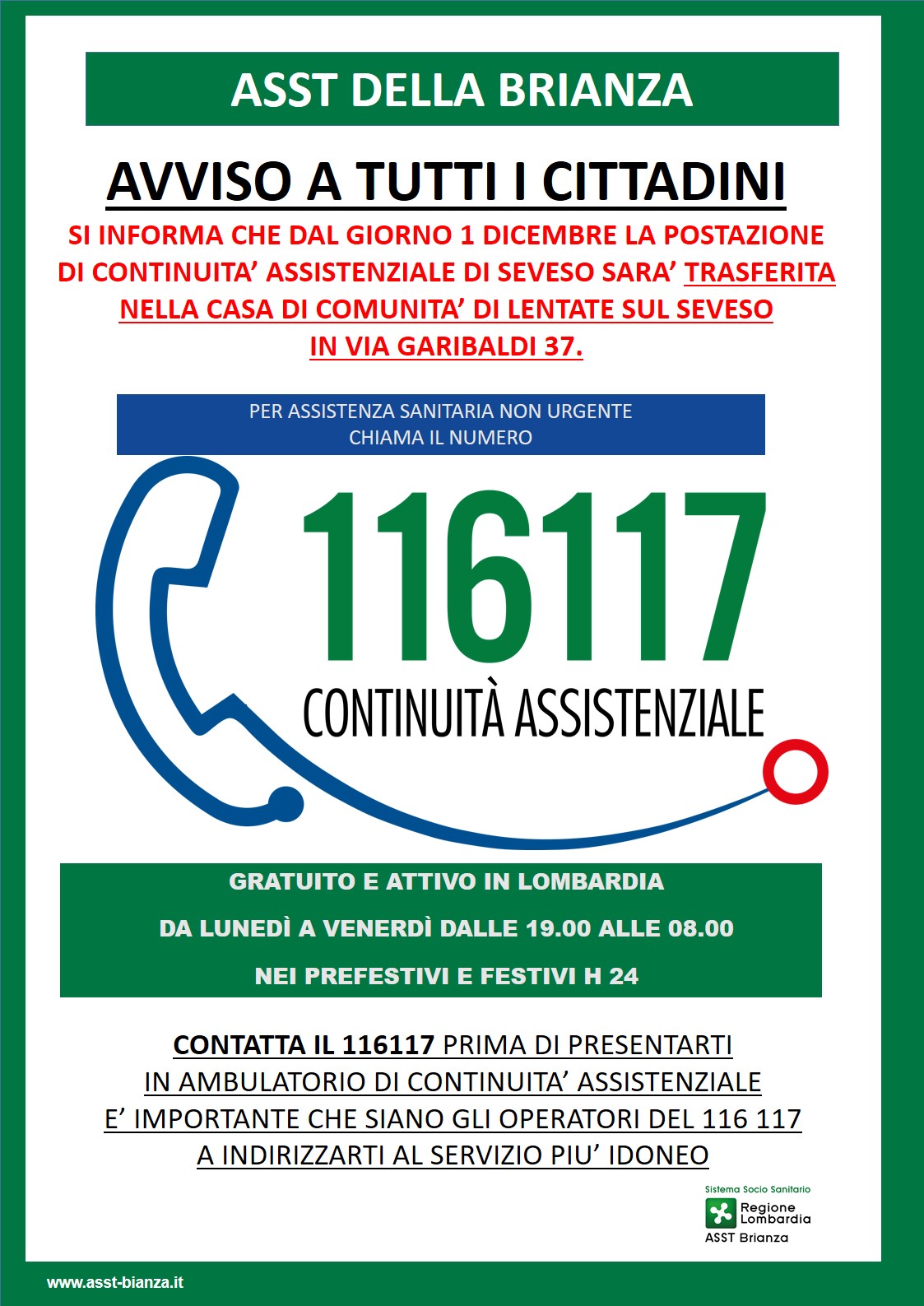 Si informa che dal 1° dicembre 2025 la postazione di Continuità Assistenziale (ex Guardia Medica) di SEVESO sarà trasferita presso la Casa di Comunità di LENTATE SUL SEVESO, in via Garibaldi 37.