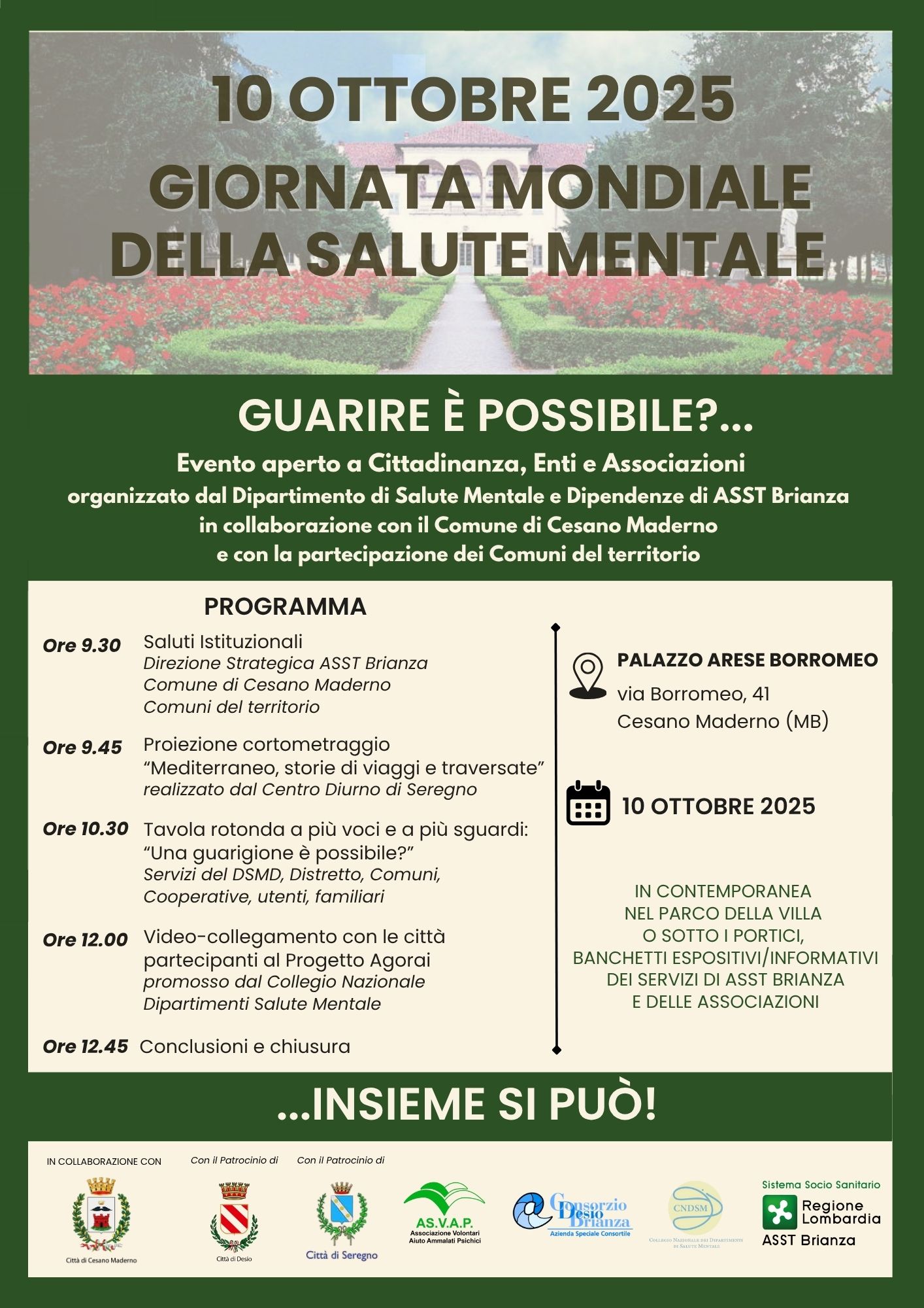 In occasione della Giornata Mondiale della Salute Mentale, il 10 ottobre 2025 a Palazzo Arese Borromeo di Cesano Maderno il Dipartimento Salute Mentale e Dipendenze di ASST Brianza, in collaborazione con il Comune di Cesano Maderno e la partecipazione di altre Amministrazioni del territorio, organizza un evento di sensibilizzazione e condivisione sulla giornata.