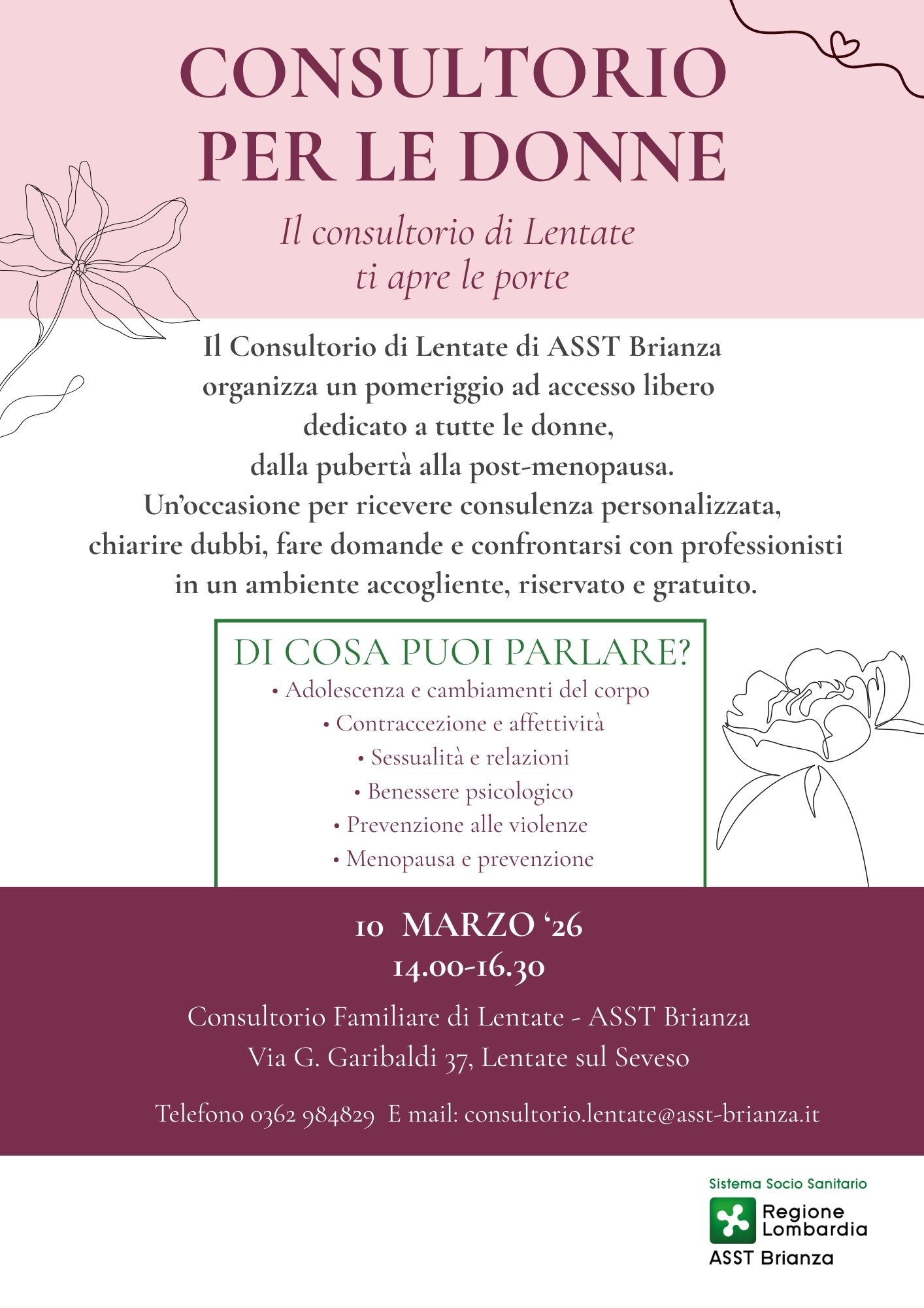 In occasione della Giornata internazionale dei diritti della donna, i Consultori Familiari di ASST Brianza di Vimercate, Lentate sul Seveso e Desio organizzano alcuni pomeriggi ad accesso libero dedicati a tutte le donne, dalla pubertà alla menopausa. Un'occasione per ricevere consulenza personalizzata, chiarire dubbi, fare domande e confrontarsi con professionisti in un ambiente accogliente, riservato e gratuito.