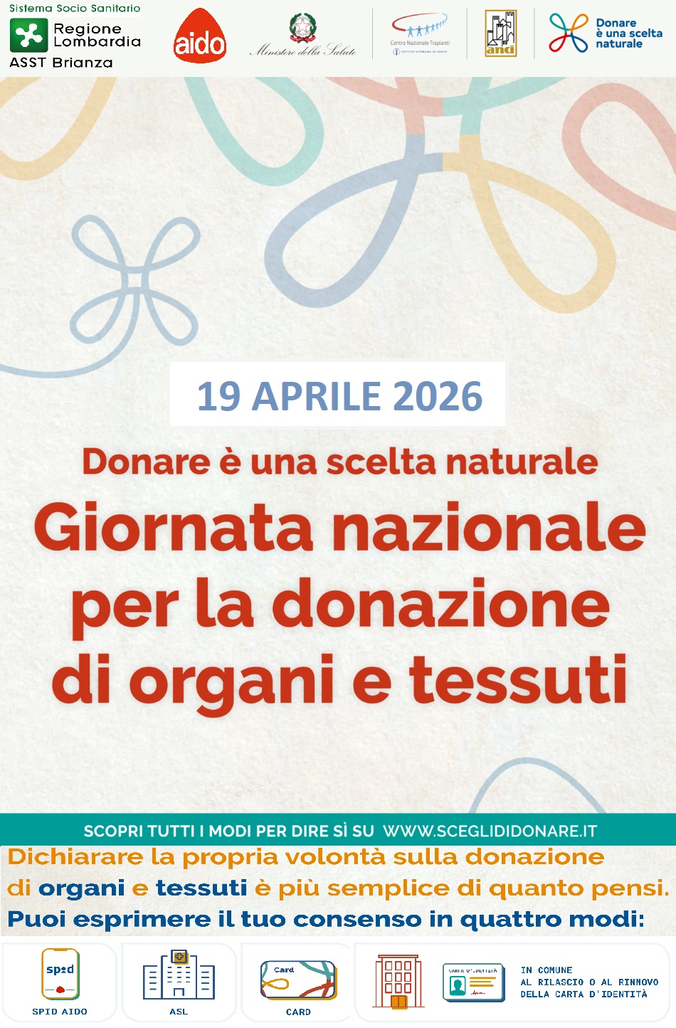 In occasione della ventinovesima Giornata nazionale per la donazione di organi e tessuti che si celebra il 19 aprile 2026, ASST Brianza rinnova il proprio impegno nel promuovere la cultura del dono e sostiene la campagna nazionale promossa dal Ministero della Salute e dal Centro Nazionale Trapianti, che invita tutti i cittadini a informarsi per compiere una scelta consapevole sulla donazione di organi e tessuti, soprattutto al rinnovo della carta di identità. Il messaggio per l’anno 2026 è: “Dai voce al tuo Sì. Scegli di donare”.