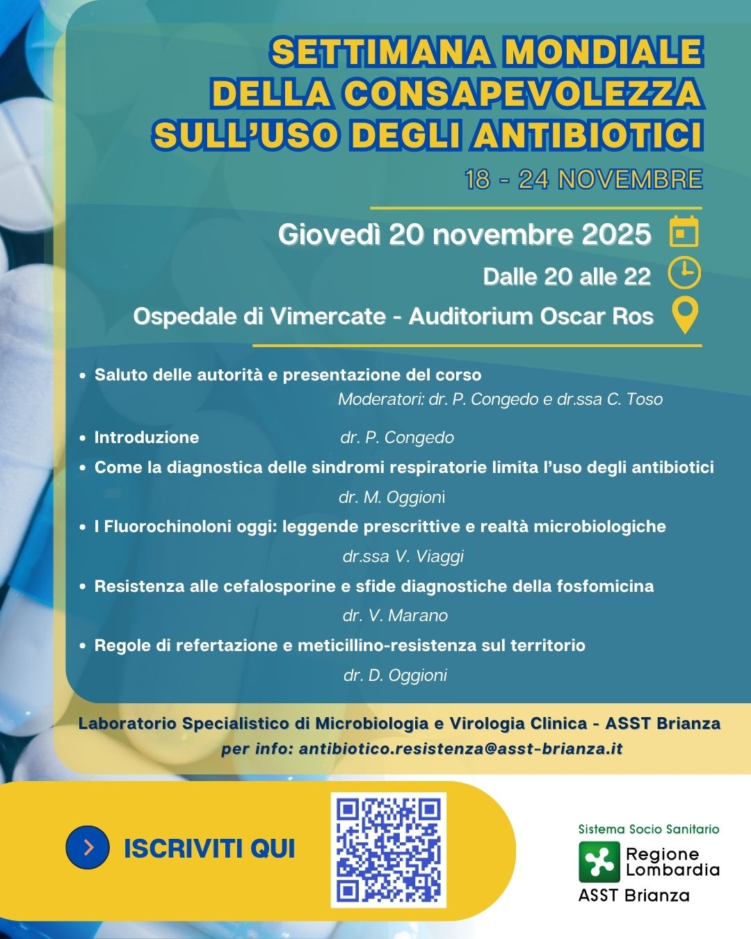 In occasione della Settimana Mondiale della consapevolezza sull'uso degli antibiotici, il Laboratorio Specialistico di Microbiologia e Virologia Clinica di ASST Brianza organizza un incontro rivolto a Medici di Medicina Generale, Pediatri di Libera Scelta, Specialisti e Tecnici nella serata di giovedì 20 novembre, alle ore 20, presso l'Auditorium Oscar Ros dell'Ospedale di Vimercate.