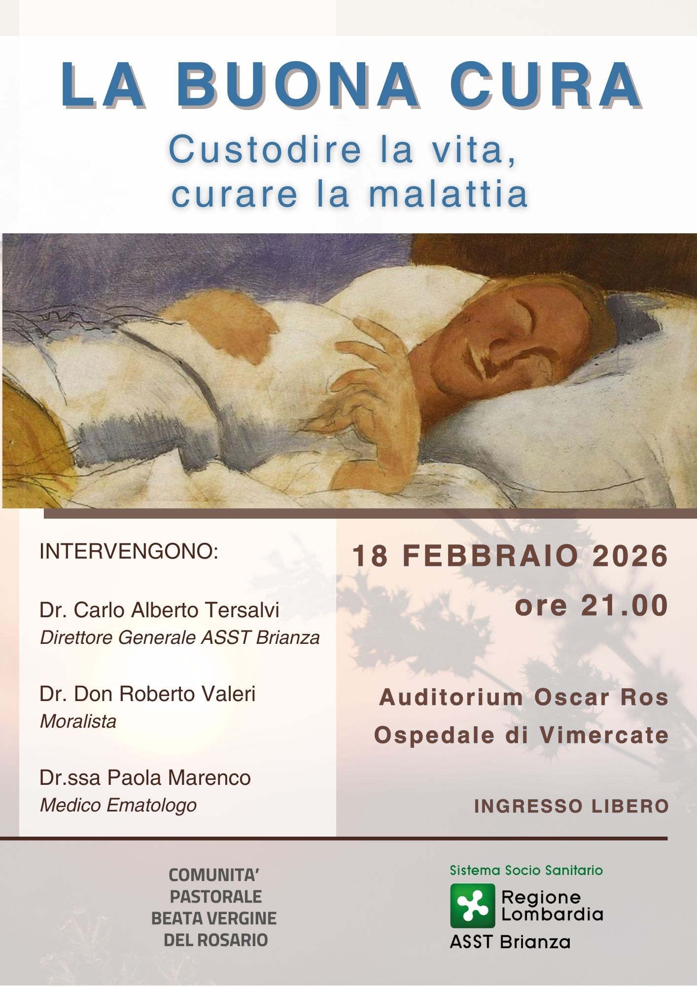 Il 18 febbraio 2026 alle ore 21, presso l'Auditorium Oscar Ros dell'Ospedale di Vimercate (2° piano), è in programma l'incontro dal titolo "La buona cura: custodire la vita, curare la malattia".