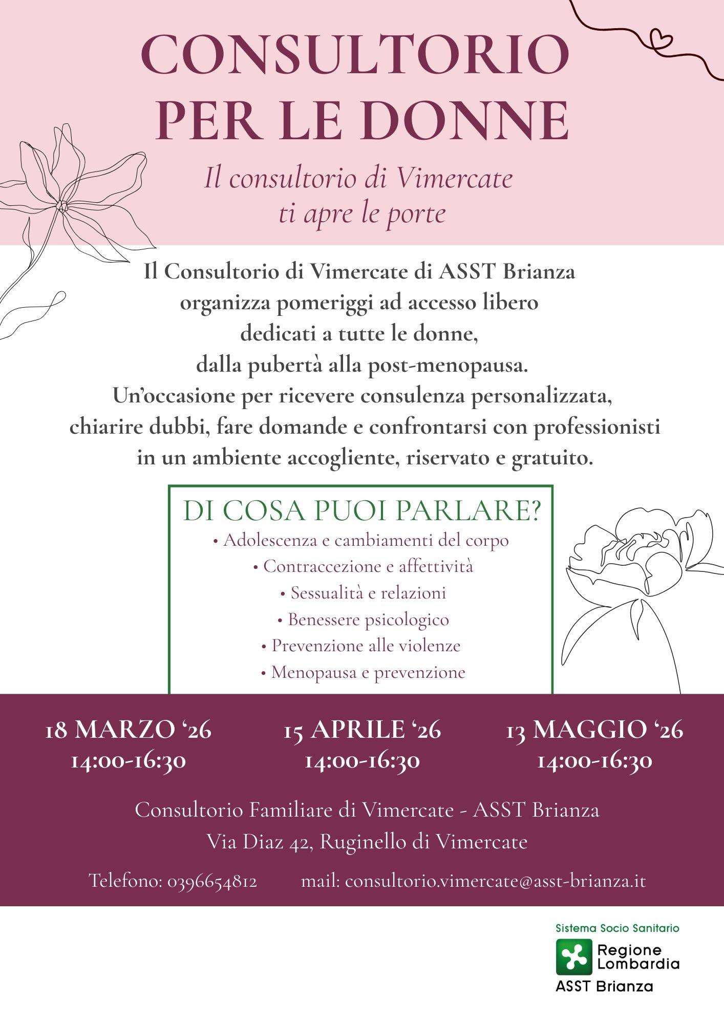 In occasione della Giornata internazionale dei diritti della donna, i Consultori Familiari di ASST Brianza di Vimercate, Lentate sul Seveso e Desio organizzano alcuni pomeriggi ad accesso libero dedicati a tutte le donne, dalla pubertà alla menopausa. Un'occasione per ricevere consulenza personalizzata, chiarire dubbi, fare domande e confrontarsi con professionisti in un ambiente accogliente, riservato e gratuito.